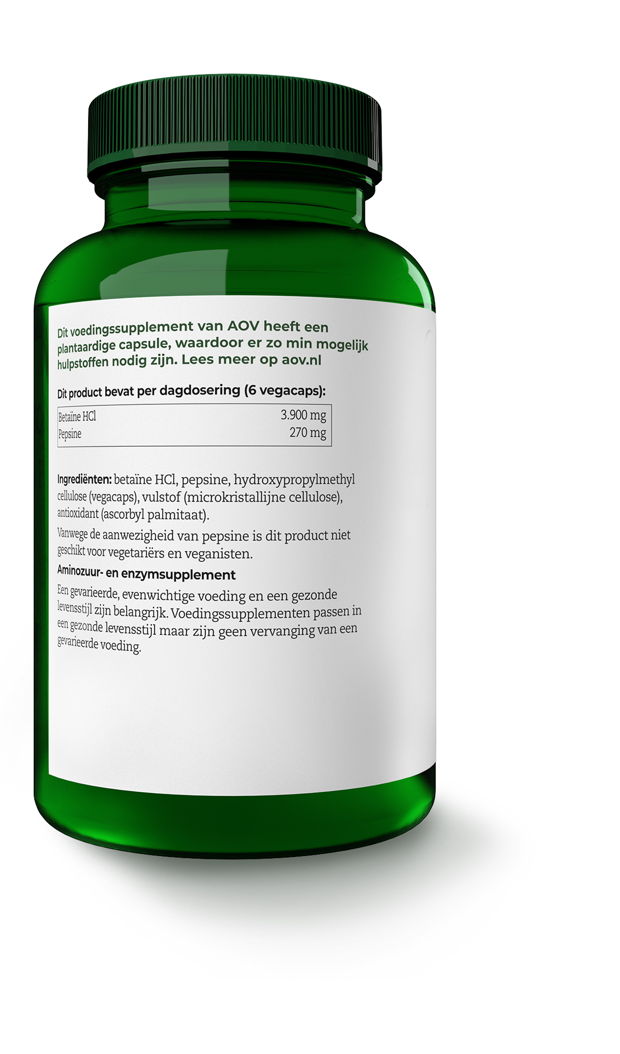 Niet geschikt voor vegetariers en veganisten. De enzymen betaïne en pepsine (of peptase) komen van nature voor in ons lichaam voor, maar ook in andere levende organismen zoals dieren en planten. In voeding zijn enzymen vooral te vinden in vers (onbewerkt) voedsel, zoals verse sla en rauwe groente.
