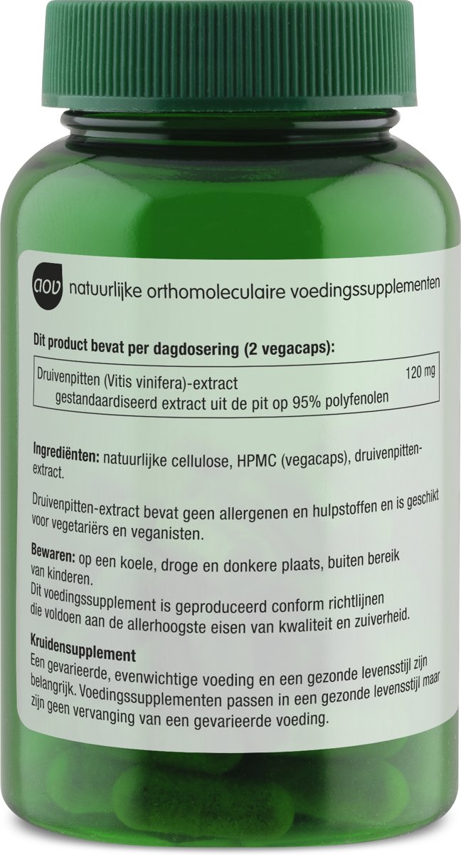 AOV 807 Druivenpitten extract bevat 120 mg druivenpitextract per dagdosering (2 vegacaps). Gestandaardiseerd extract uit de pit.