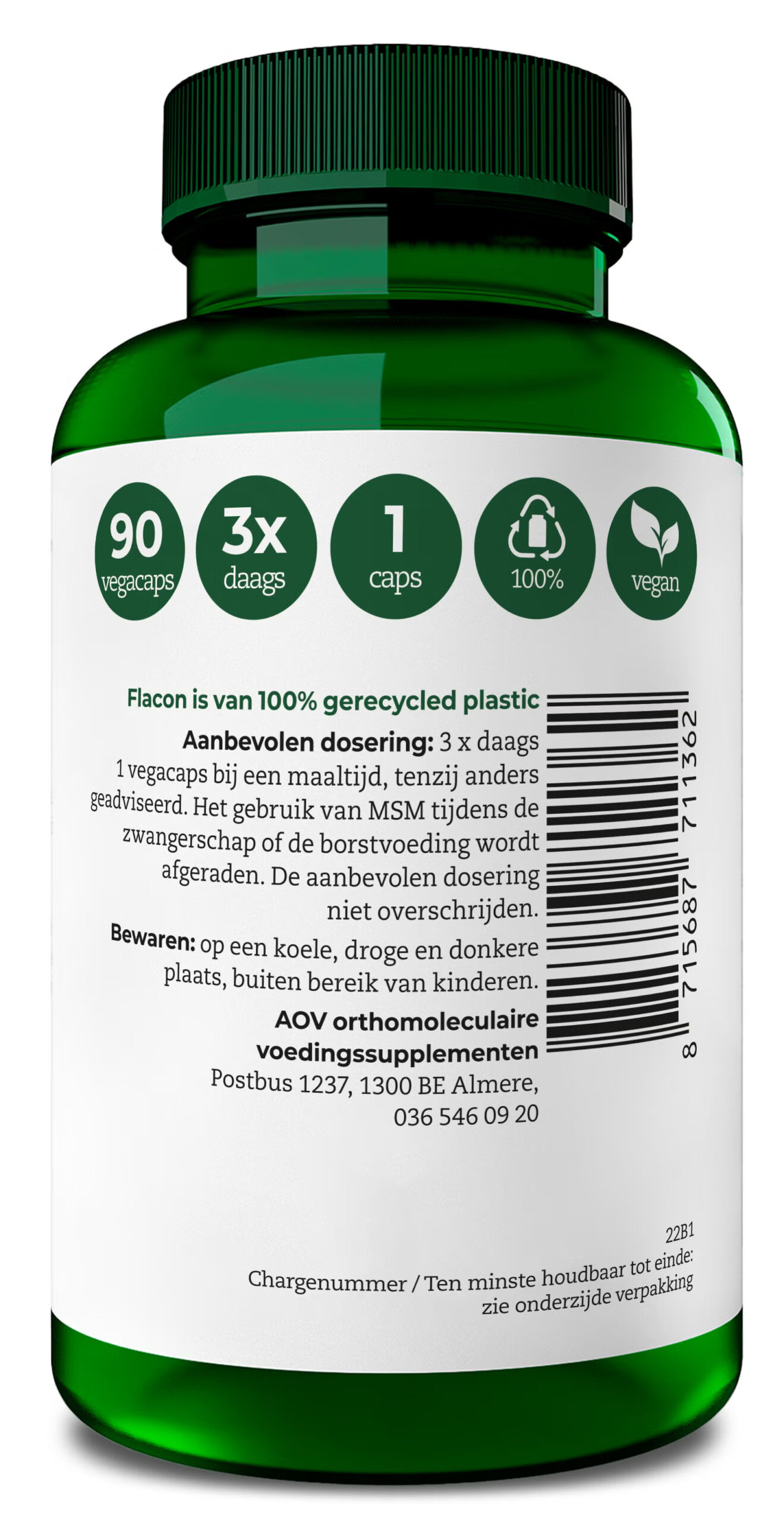 AOV 1136 MSM bevat organisch gebonden zwavel. MSM is de afkorting van methylsulfonylmethaan, een organische zwavelverbinding die bestaat uit zwavel en methylgroepen. MSM komt van nature voor in groente en fruit. De vitamines en mineralen in de producten van AOV hebben een zo natuurlijk mogelijke vorm, zodat het lichaam deze makkelijker herkent en opneemt.