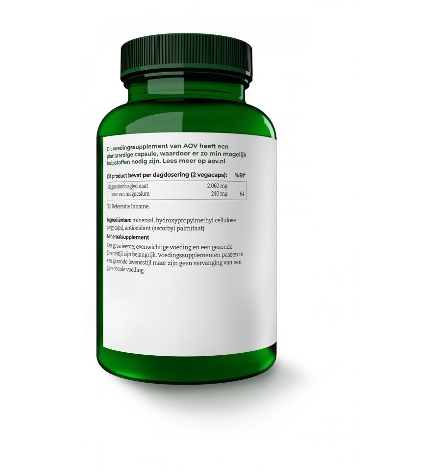 De magnesium supplementen met glycinaat van AOV bevatten per vegacaps een organisch, aminozuurgebonden vorm van magnesium. AOV 515 Magnesium bisglycinaat levert 120 mg magnesium per vegacaps