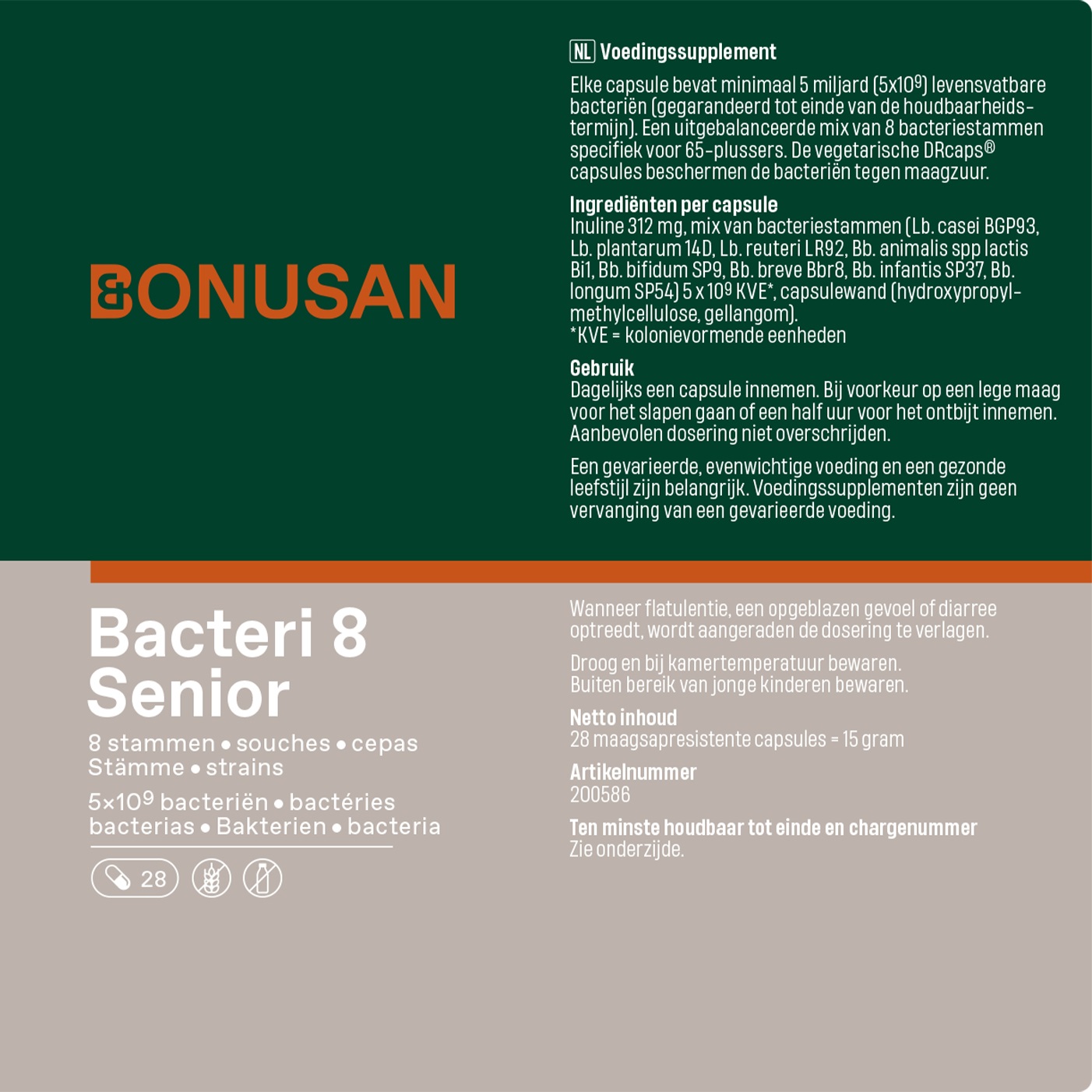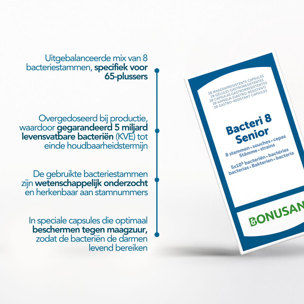 In het microbioom van 65-plussers zien we een afname van de hoeveelheid bifidobacteriën. Bovenop de juiste voeding kan een probiotica supplement met extra bifidobacteriën een mooie aanvulling bieden. Bonusan Bacteri 8 Senior bevat dan ook maar liefst 5 soorten bifidobacteriën, aangevuld met 3 soorten lactobacillen (melkzuurbacteriën).