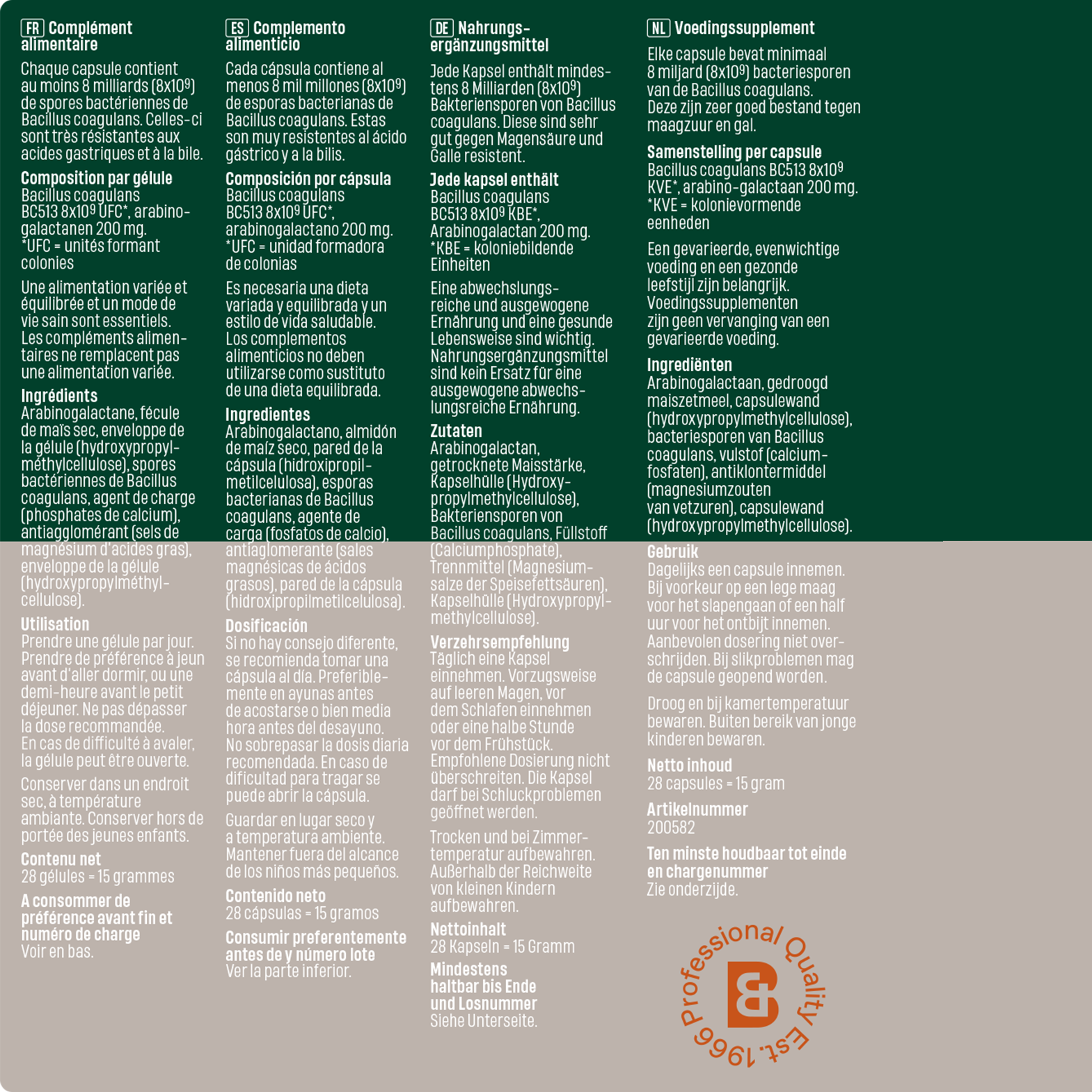 Arabinogalactaan, gedroogd maiszetmeel, capsulewand (cellulose (HPMC)), bacteriesporen van Bacillus coagulans, vulstof (dicalciumfosfaat), antiklontermiddel (magnesiumstearaat).