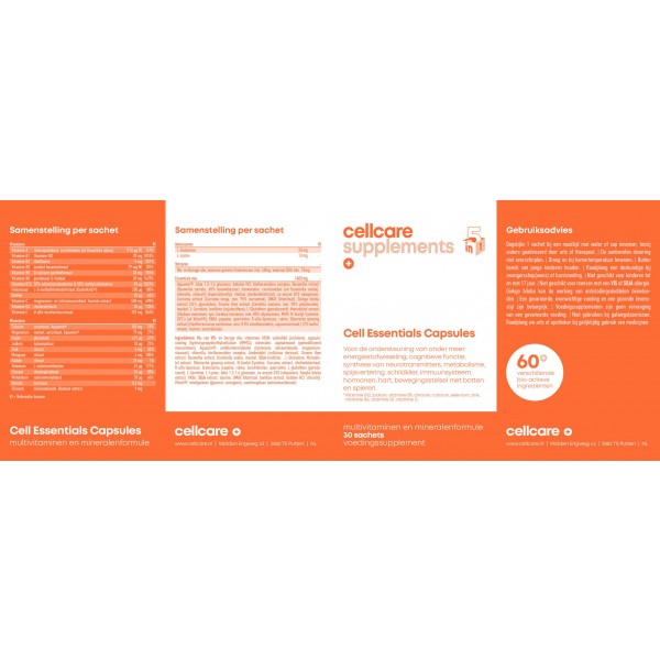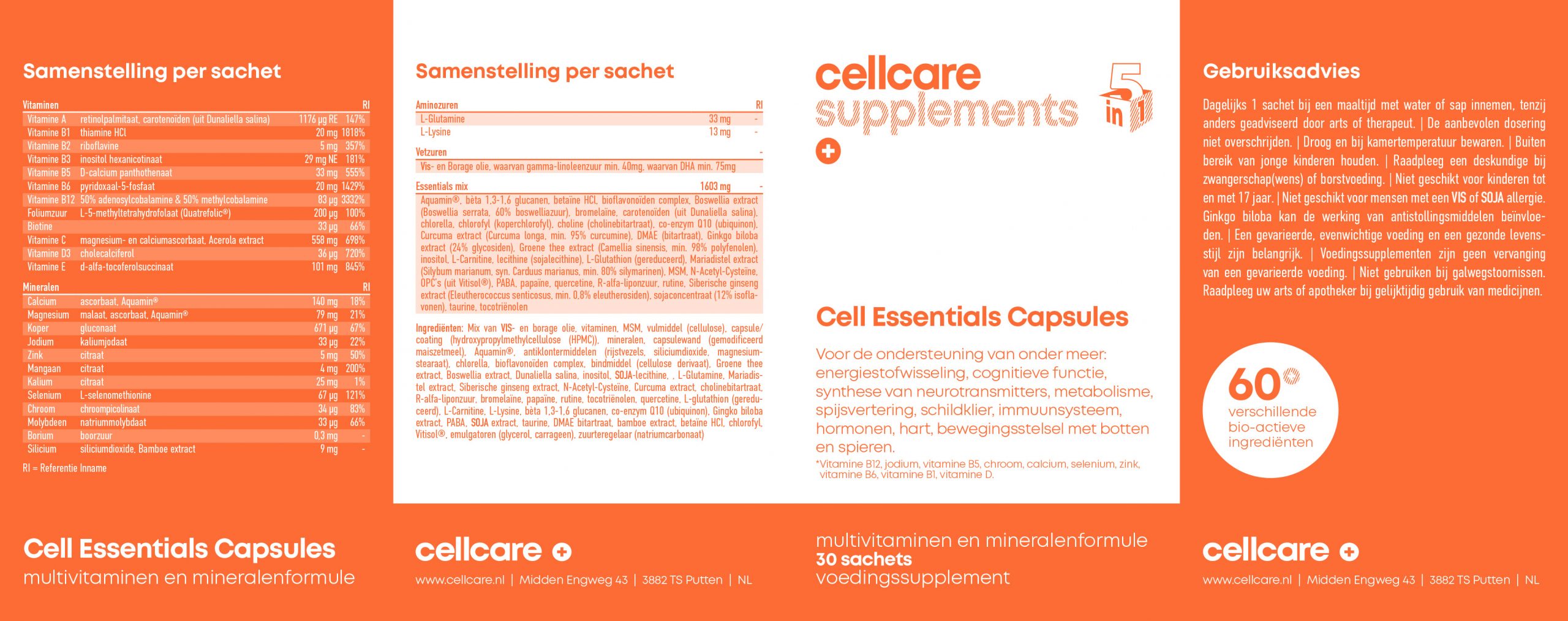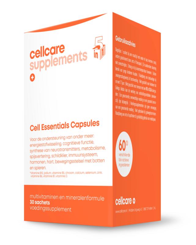 Cellcare Cell Essentials Capsules voor de ondersteuning van onder meer: energiestofwisseling, cognitieve functie, synthese van neurotransmitters, metabolisme, spijsvertering, schildklier, immuunsysteem, hormonen, hart, bewegingsstelsel met botten en spieren.*