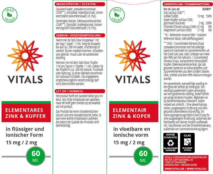 Vitals Elementair Zink & Koper bevat als basis ‘concentrated mineral drops’ (CMD), een speciaal zeewaterconcentraat uit het Great Salt Lake (Utah, USA) met het volledige spectrum mineralen en spoorelementen (ontdaan van bijna alle natrium, en in dit geval aangevuld met extra zink in de vorm van zinksulfaat en extra koper als kopergluconaat). Dit product wordt vervaardigd door middel van een traditioneel en natuurlijk concentratieproces met gebruik van de zon.