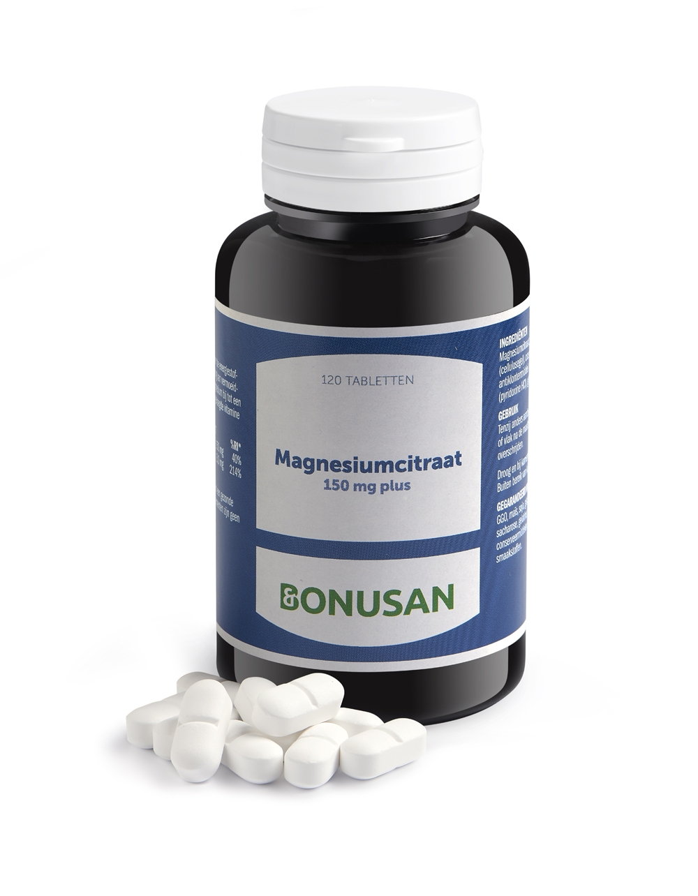 Magnesiumcitraat 150mg plus Bonusan is een mineralenpreparaat, bevat veel magnesium in een kleine, makkelijk slikbare tablet. Deze Magnesiumcitraat 150 mg plus wordt zeer goed opgenomen door het lichaam.