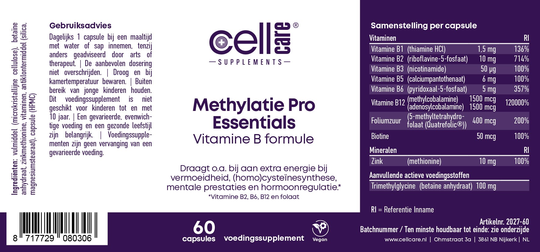 Cellcare Methylation Essentials bevat de complete reeks B-vitaminen B1, B2, B3, B5, B6, B12, folaat en biotine in hun natuurlijke vormen. Methylatie Pro Essentials is een verbeterde versie van onze Methylation Essentials, welke de vitaminen B2, B6, B12 en foliumzuur bevatte. Deze basis is uitgebreid met de andere B-vitaminen, zink en trimethylglycine voor een complete formule met methyldonoren en cofactoren.