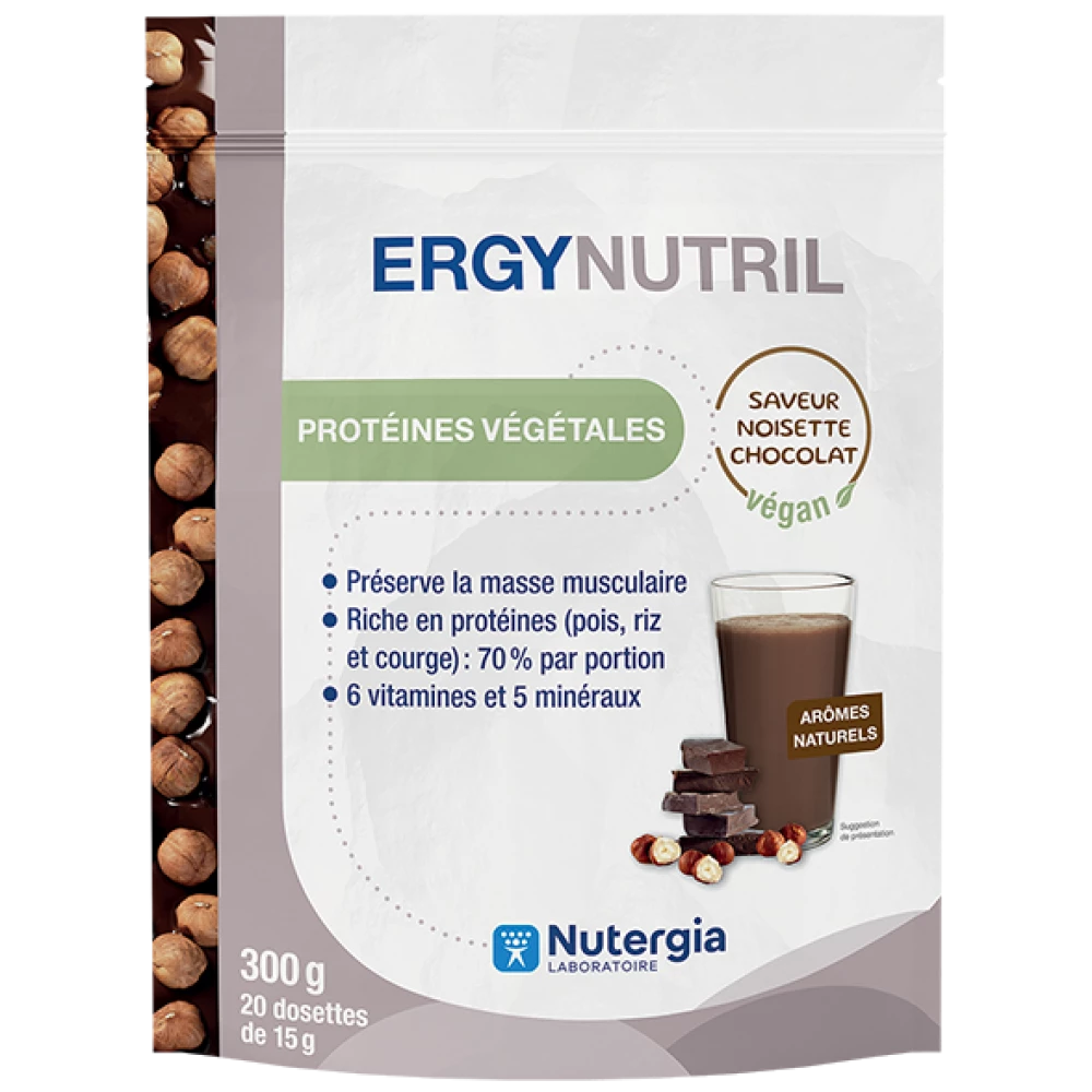 ERGYNUTRIL is een product ontwikkeld op basis van 3 bronnen van plantaardige eiwitten (erwten, rijst, pompoen) met natuurlijke aroma’s, zonder kleurstoffen en zoetstoffen voor een maximaal natuurlijk karakter. De formule is rijk aan eiwitten (70% per portie) en bevat amper 2,7 g koolhydraten per dosis. Ze is versterkt met 6 vitaminen en 5 mineralen voor een gebalanceerde formule met Nutergia Ergynutril Vegan Chocolade hazelnoot.