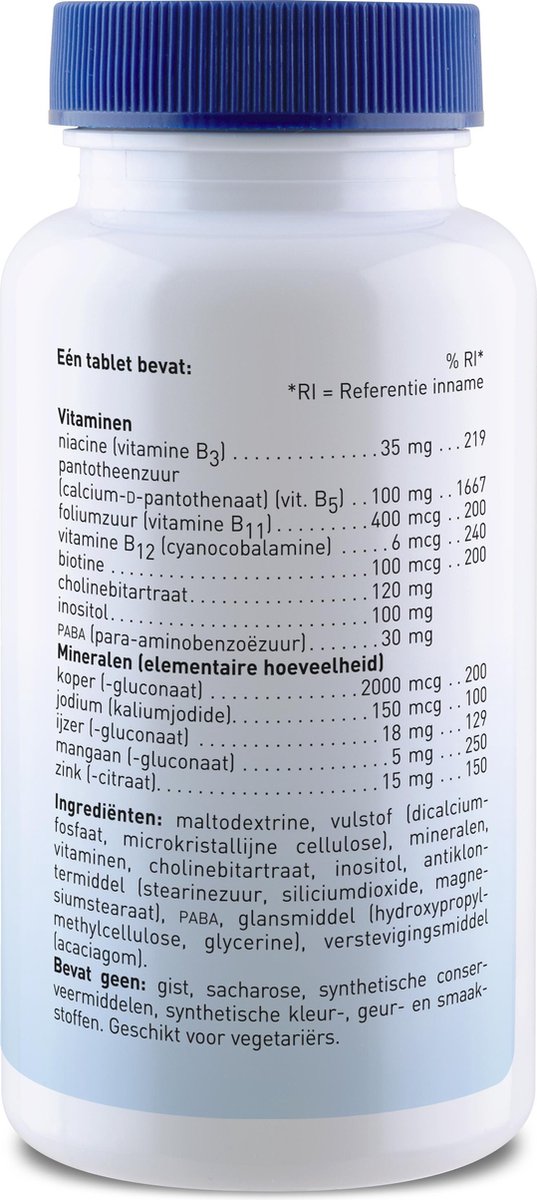 Maltodextrine, vulstof (dicalciumfosfaat, microkristallijne cellulose), mineralen, vitaminen, cholinebitartraat, inositol, antiklontermiddel (stearinezuur, siliciumdioxide, magnesiumstearaat), PABA, glansmiddel (hydroxypropylmethylcellulose, glycerine), verstevigingsmiddel (acaciagom). Vrij van: Gist, sacharose, lactose, gluten, dierlijke bestanddelen, soja-eiwit, niet natuurlijke conserveermiddelen en synthetische kleur-, geur- en smaakstoffen.