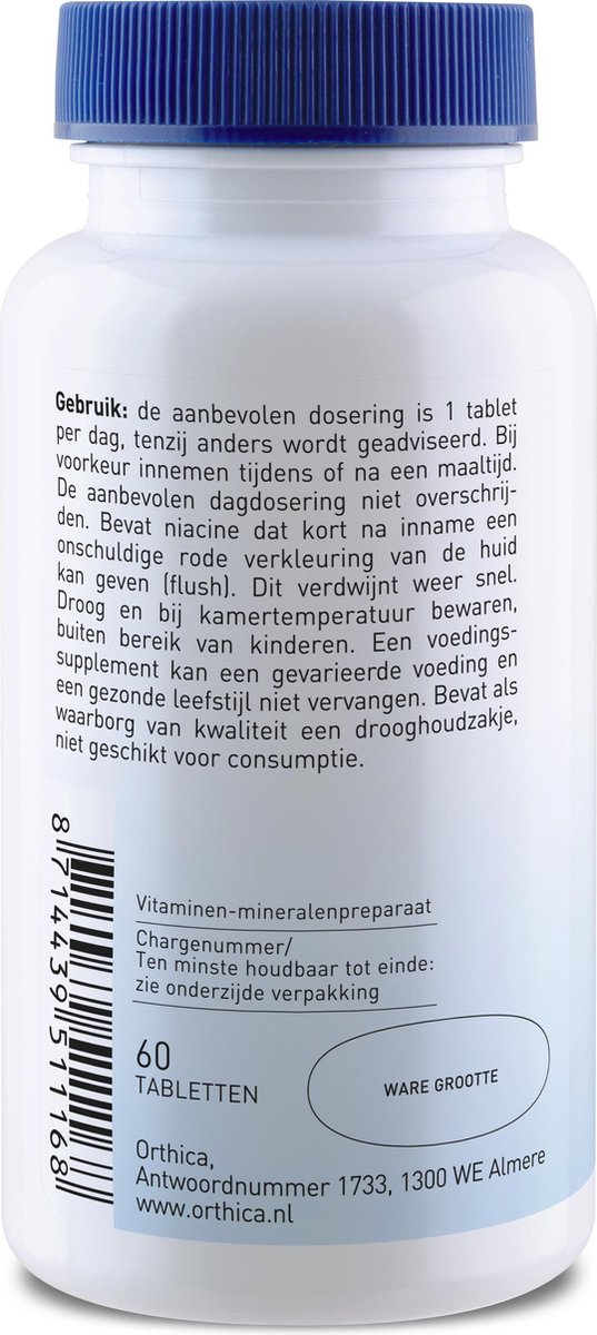 Bevat niacine dat kort na inname een onschuldige rode verkleuring van de huid kan geven (flush). Dit verdwijnt weer snel. Droog en bij kamertemperatuur bewaren, buiten bereik van kinderen. Een voedingssupplement kan een gevarieerde voeding en een gezonde leefstijl niet vervangen.