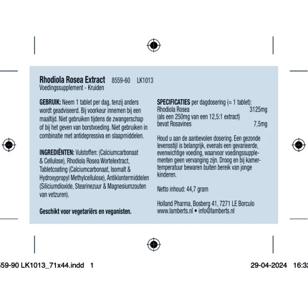 Lamberts Rhodiola Rosea bevat een variëteit aan potentieel actieve ingrediënten, waarvan de Rosavines de meest bekende zijn. Lamberts Rhodiola Rosea is een krachtig extract, met een gegarandeerde hoeveelheid van 7,5mg Rosavines per tablet
