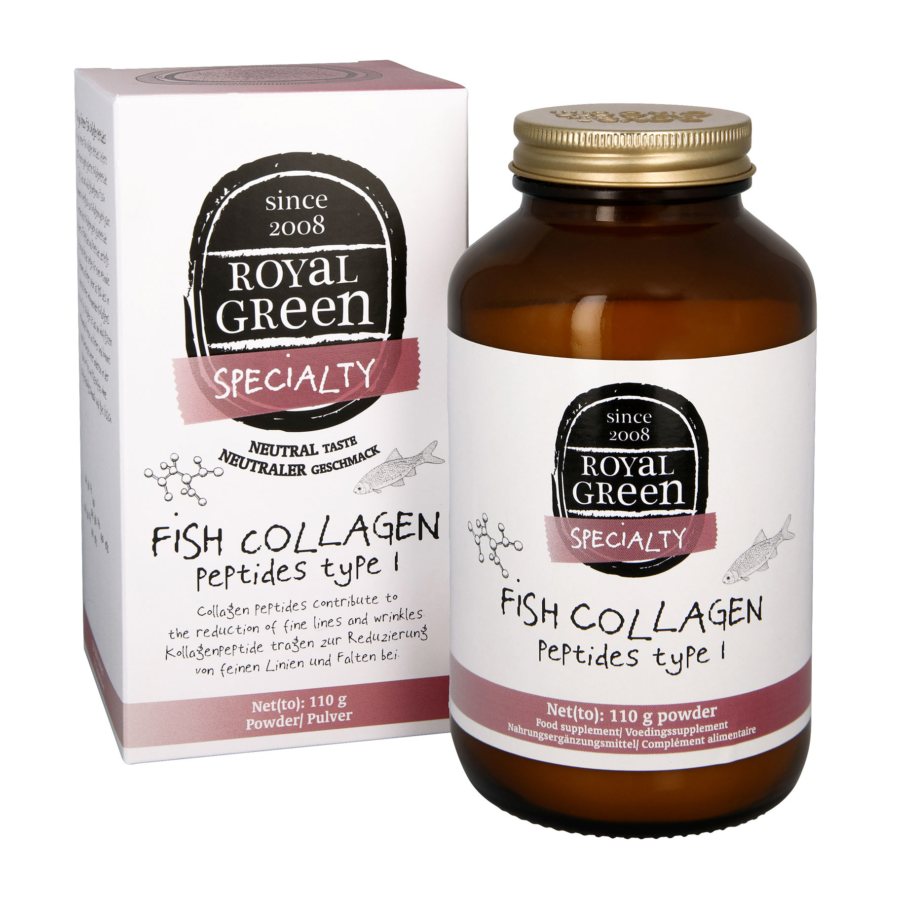 Royal Green Fish collagen peptides levert 100% zuiver gehydrolyseerde collageenpeptiden type 1, afkomstig van wild gevangen vis. Deze collageen hydrolysaat peptiden zijn in vergelijking met collageen hydrolysaat nog kleiner afgebroken tot tripeptiden en dipeptiden