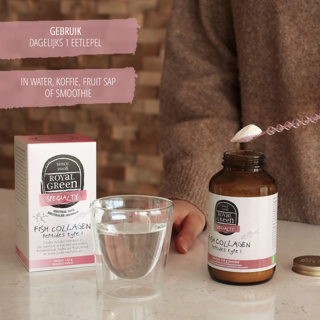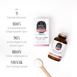 Collageen is het meest voorkomende eiwit in het lichaam en wordt van nature aangetroffen in huid. Viscollageen bestaat voornamelijk uit type 1 collageen, daarom kiest Royal Green voor viscollageen. Royal Green Fish collagen peptides is vrij van vulstoffen, heeft geen visnasmaak en is goed oplosbaar.