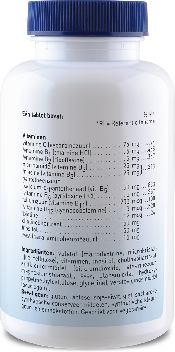 5 mg foliumzuur (vitamine B11) 200 mcg vitamine B12 (cyanocobalamine) 13 mcg biotine 12 mcg cholinebitartraat 50 mg inositol 50 mg PABA (para-aminobenzoëzuur) 15 mg.