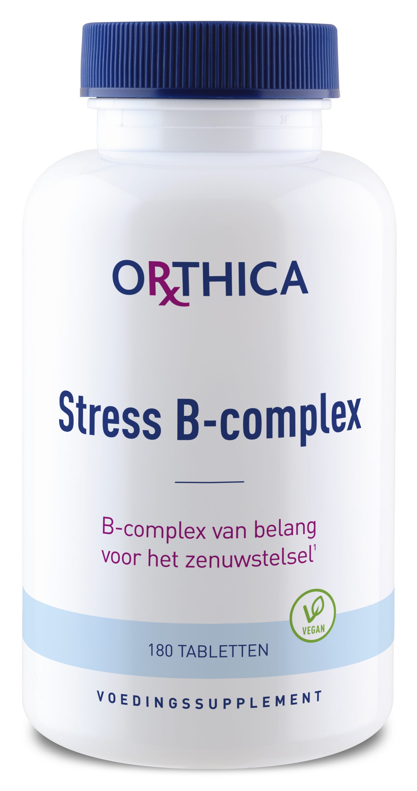 Stress-B-Complex Orthica: B-complex is een verzamelnaam voor een groep B-vitaminen. Een deel van deze vitaminen zijn van belang voor het zenuwstelsel, terwijl een B-vitamine als foliumzuur de weerstand tegen stress verhoogt. B-vitaminen haal je allereerst uit een gezonde en gevarieerde voeding.