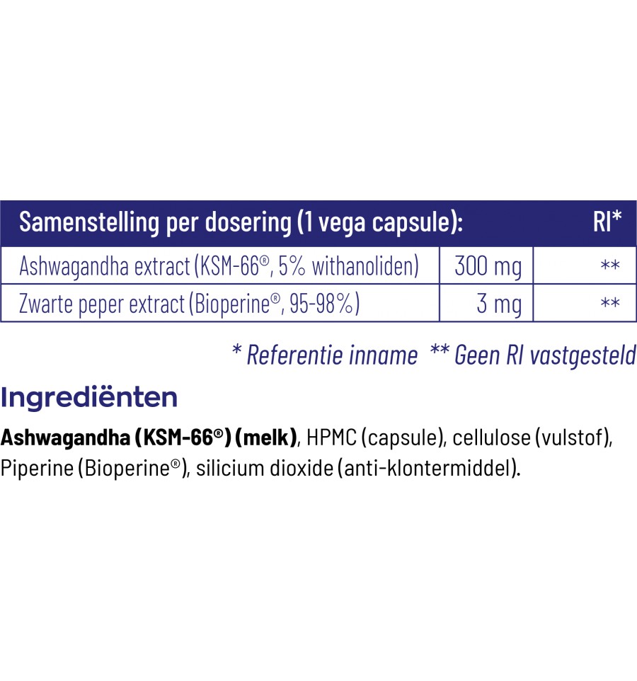 Ashwagandha (KSM-66®) (MELK), HPMC (capsule), cellulose (vulstof), Piperine (Bioperine®), silicium dioxide (anti-klontermiddel)