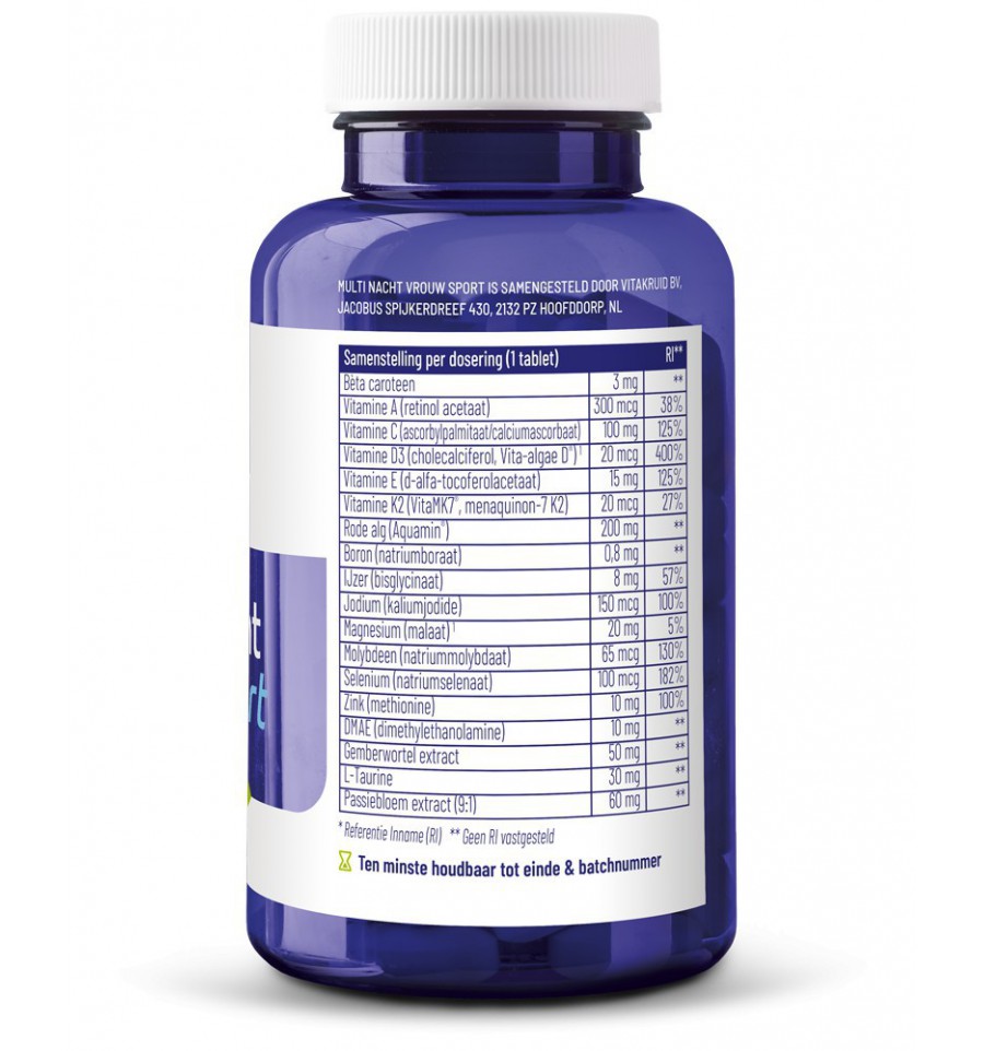 Vitakruid Multi Nacht Vrouw Sport is een voedingssupplement. Aanbevolen dosering niet overschrijden.