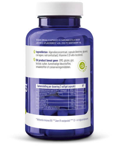De Vegan Omega-3 capsules is een natuurproduct, wat betekent dat hoeveelheden DHA en EPA kunnen variëren. We garanderen echter wel een totale hoeveelheid van 500 mg omega 3, en een minimum van 100 mg EPA en 300 mg DHA per capsule.