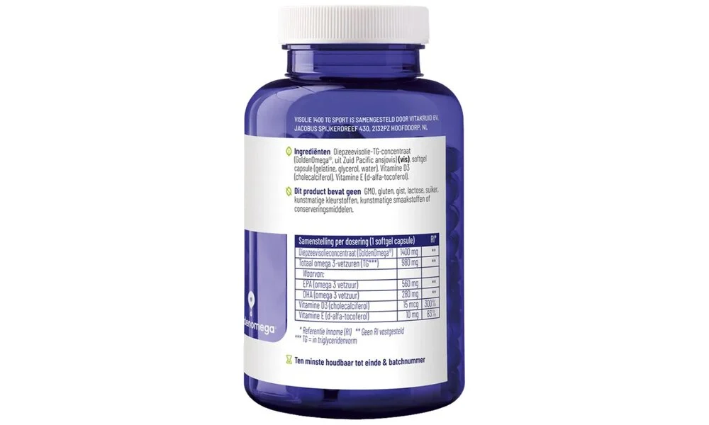 Als aanvulling op deze hoog gedoseerde formule hebben we ook 15 mcg vitamine D3 toegevoegd. Bij gebruik van de Visolie 1400 TG® Sport en één van onze Multi Dag & Nacht-supplementen hoeven de meeste mensen geen extra vitamine D meer te slikken.