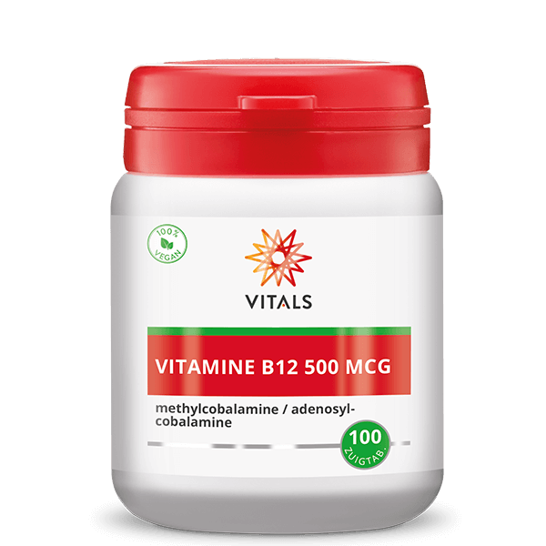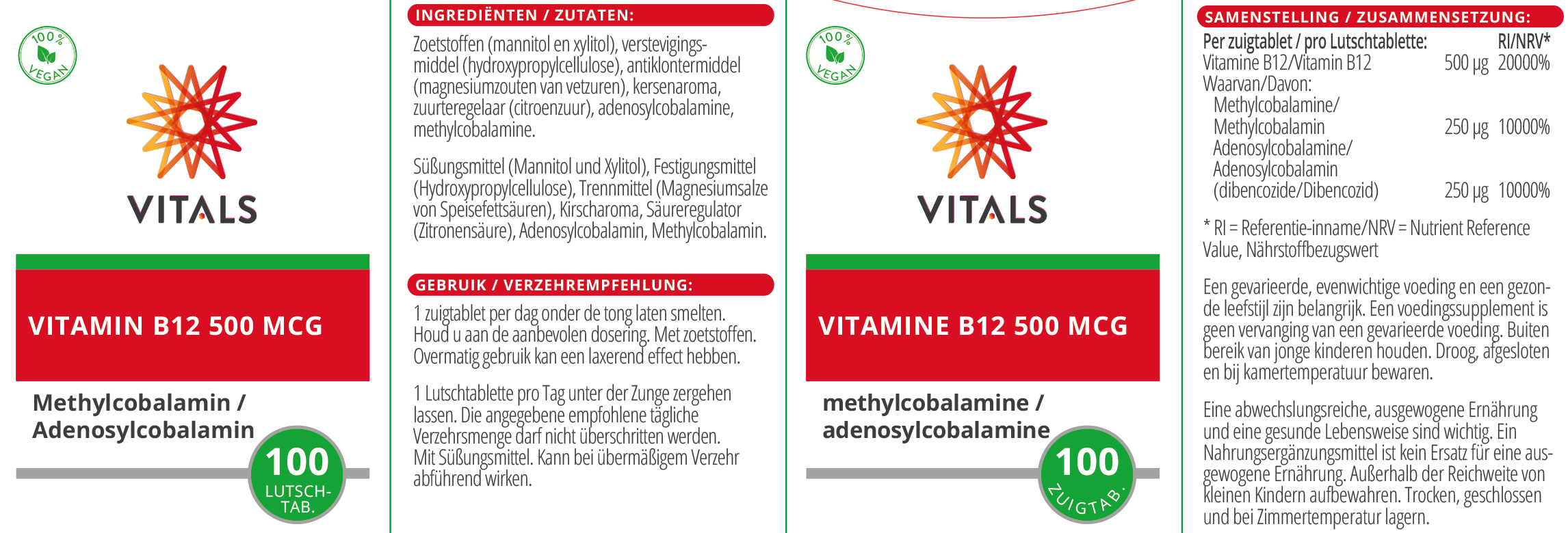 Vitals Vitamine B12 500mcg bestaat uit zuigtabletjes met een onderhoudsdosering van de biologisch actieve vormen methylcobalamine en adenosylcobalamine (ook wel dibencozide genoemd). Dit zijn de vormen zoals vitamine B12 in de voeding voorkomt en door het lichaam gebruikt wordt