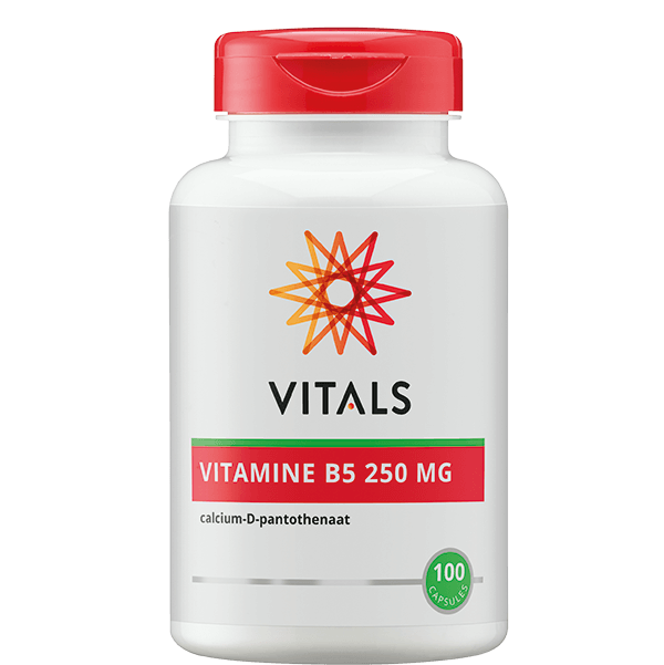 Vitamine B5 250 mg van Vitals biedt een hoge dosering in zuivere vorm. De grondstof zit in een plantaardige capsule uit cassave en is aangevuld met een hulpstof uit rijst.