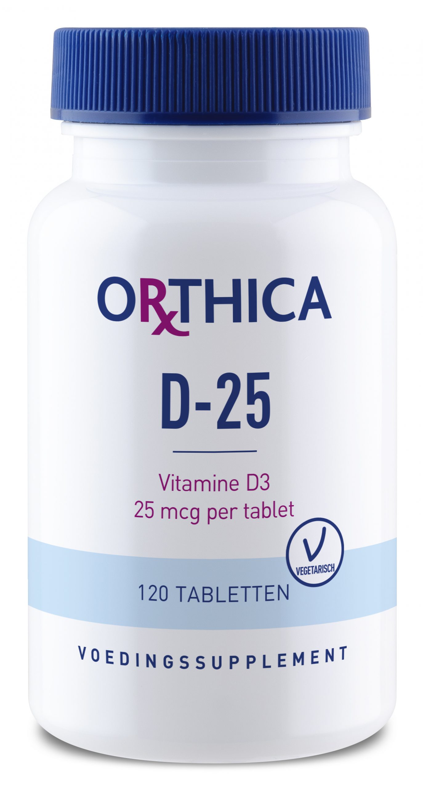 Vitamine D-25 Orthica bevordert het natuurlijk afweersysteem. Een tablet bevat vitamine D3 (cholecalciferol) (1000ie) 25mcg (500% ADH)