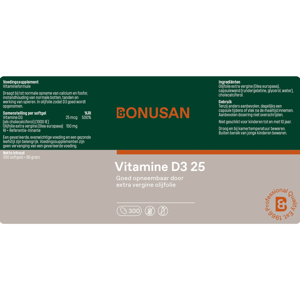 Bonusan volgt de wetenschap op de voet, en heeft daarom speciaal Vitamine D3 25 mcg ontwikkeld. D3 is tot wel tien maal werkzamer dan het veelgebruikte D2. Het product is extra hoog gedoseerd voor een optimaal vitamine D-gehalte in het lichaam. De toevoeging van middellangeketenvetzuren kan zorgen voor een sterk verbeterde opname van onze D3.