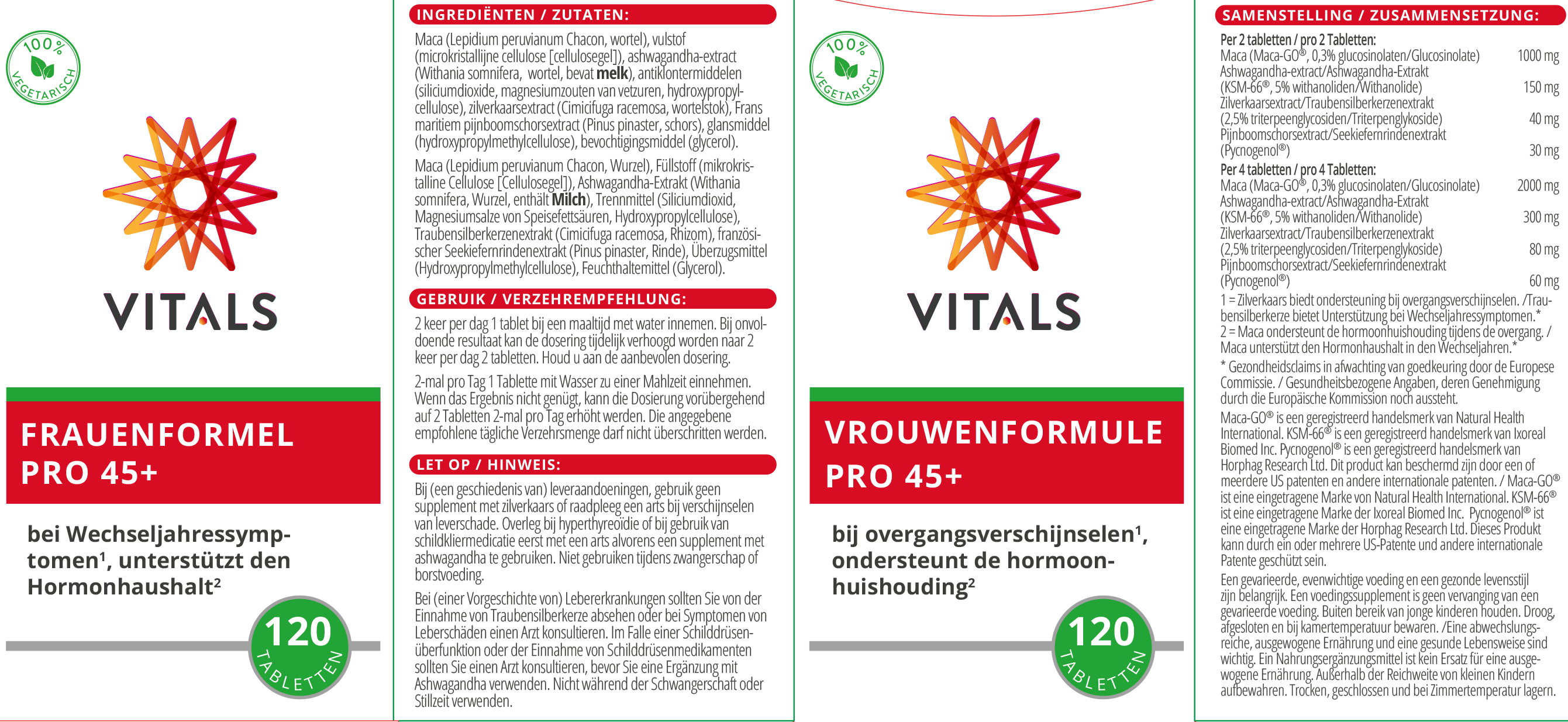 Raadpleeg een deskundige alvorens supplementen te gebruiken in geval van zwangerschap, lactatie, medicijngebruik en ziekte. Aanbevolen dosering van Vitals Vrouwenformule Pro 45+ niet overschrijden.
